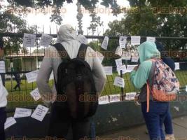 Cabe mencionar que, de acuerdo con fotografías obtenidas, los estudiantes de la UV se presentaron por la mañana frente a la vicerrectoría para colocar sus consignas, con textos impresos en papel bond, pero cubiertos del rostro para no ser identificados.
