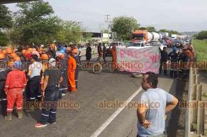 Un grupo de más de 140 trabajadores de la empresa Metalmecánica Especializada del Golfo S.A. de C.V. (MEGSA) bloqueó este jueves la autopista Cardel-Tihuatlán, a la altura de la gasolinera Toro Negro, frente a las instalaciones de la compañía, en las inmediaciones del puente Cazones 3.