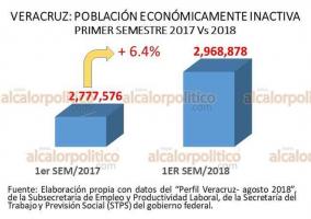 Lo anterior implica que este año la cifra de la Población Económicamente Inactiva en el estado de Veracruz, al primer semestre de este año, se incrementó en 191 mil 302 personas, esto es, en 6.4 por ciento con respecto al de 2017.