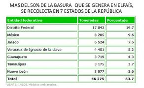 De acuerdo al INEGI, en México se recolectan diariamente 86 mil 343 toneladas de basura, de las cuales siete estados de la República Mexicana generan 46 mil 275 toneladas cada día, esto es, más del 50 por ciento del total (53.7%)