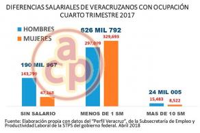 Veracruz es un estado de contrastes salariales, pues al cierre del año 2017, de los más de 3.1 millones de personas ocupadas, 190 mil de ellas no cobran salario alguno; casi 627 mil perciben menos de 88 pesos diarios y sólo 24 mil veracruzanos ganan más de 10 salarios mínimos diariamente, de acuerdo a la Secretaría del Trabajo del Gobierno Federal. (STPS).