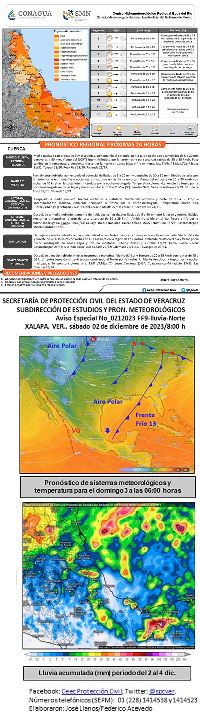 Mañana domingo se pronostica que el frente frío 13 alcance el suroeste del Golfo de México, aumentando los nublados y el potencial de lluvias. Se recomienda consultar la actualización del Aviso Especial.