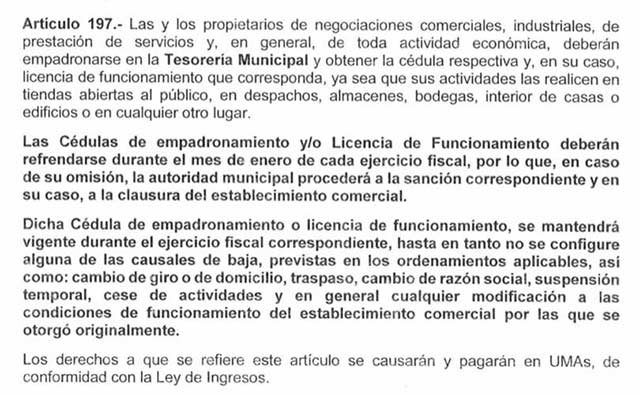 Destaca que se plantea modificar el Artículo 197 para que las y los propietarios de negociaciones comerciales, industriales, de prestación de servicios y, en general, de toda actividad económica, ahora deberán empadronarse en la Tesorería Municipal y no en la Dirección de Desarrollo Económico, obtener la cédula respectiva y, en su caso, licencia de funcionamiento que corresponda, ya sea que sus actividades las realicen en tiendas abiertas al público, en despachos, almacenes, bodegas, interior de casas o edificios o en cualquier otro lugar.