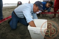 Las autoridades del programa de tortugas marinas se encargaron de levantar de la playa los 88 huevos que la tortuga lora había dejado en su nido, como parte de las medidas de seguridad para evitar que sean aplastados, comidos por perros o robados por personas.