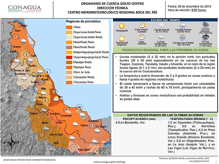 El frente frio No. 22 recorrerá el Golfo de México en dirección Este-Sureste, alcanzando la parte central de Veracruz por la tarde-noche de hoy lunes, en interacción con la corriente de vientos máximos que continuará ingresando humedad del Océano Pacifico hacia el Golfo de México, mantendrán cielo nublado con potencial para lluvias, principalmente en el Norte de Veracruz donde se esperan lluvias moderadas (5 a 20 mm) con eventos aislados fuertes (20 a 50 mm) presentándose especialmente en las cuencas de los ríos Tuxpan, Cazones, Tecolutla, Nautla y Misantla, en el resto de la región se esperan lluvias ligeras (0.1 a 5 mm) con puntuales moderados (5 a 20 mm) especialmente sobre la cuenca del río Coatzacoalcos.