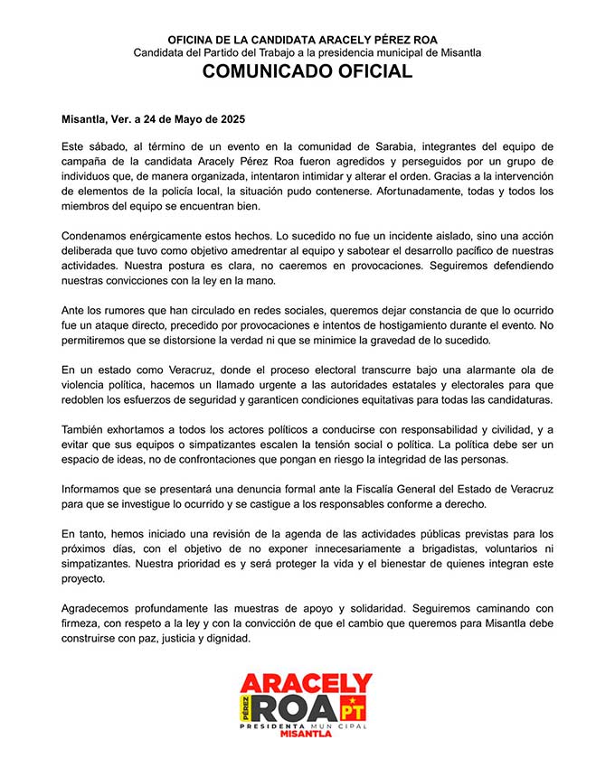 La tarde de este sábado, integrantes del equipo de campaña de la candidata Aracely Pérez Roa fueron agredidos y perseguidos por un grupo de individuos en la comunidad de Sarabia, en lo que calificaron como un acto de intimidación organizado. La situación fue contenida gracias a la intervención de elementos de la policía local, y no se reportaron personas lesionadas.