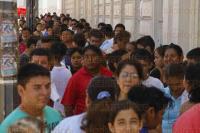Bajo temperaturas por arriba de los 35 grados centígrados, decenas de personas hicieron filas para poder inscribir a sus hijos a bachillerato, en el ciclo 2015-2016.