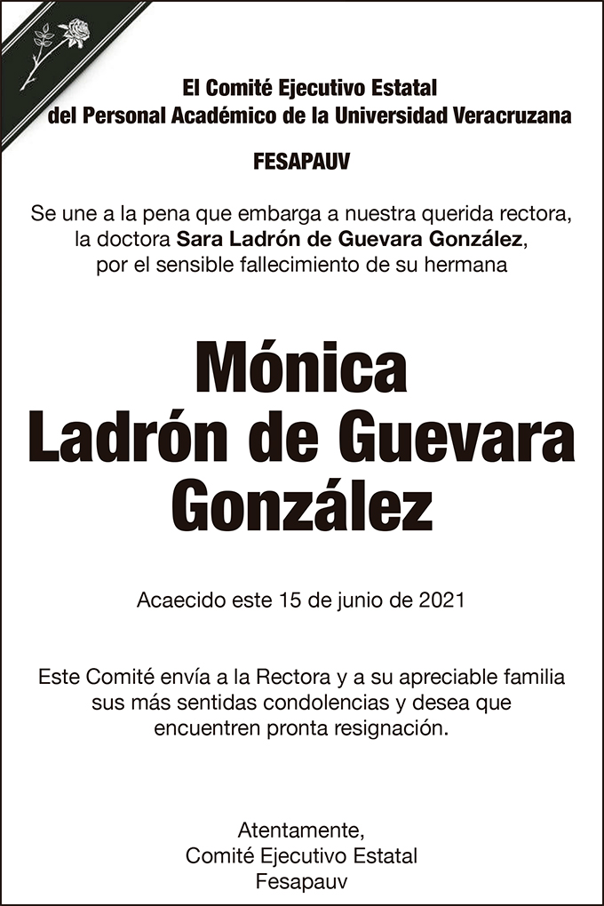 FESAPAUV se une a la pena que embarga a nuestra querida rectora, la doctora Sara Ladrón de Guevara González, por el sensible fallecimiento de su hermana Mónica Ladrón de Guevara González