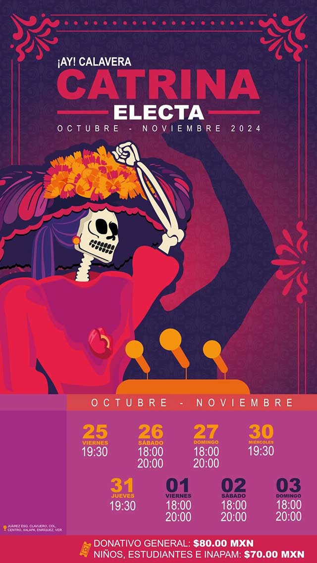Este año suman 16 años de llevar a escena “¡Ay, Calavera Catrina!”, en esta temporada de días de muertos, tiempo en el que han acumulado más de de 200 representaciones y retornan al escenario con el mismo brío y entusiasmo con su versión 2024: “¡Ay, Calavera Catrina Electa!”, espectáculo con más de 40 artistas en escena: bailarines, actores y músicos.