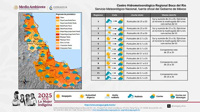 Para esta jornada. la temperatura máxima se mantendrá con poco cambio o un ligero aumento en comparación del día sábado. Durante la noche y la madrugada del lunes, el ambiente seguirá siendo fresco a frío. con posibilidad de heladas en zonas montañosas. Se espera un incremento en el potencial de lluvia y tormentas, especialmente en el norte del Estado desde esta noche, condición que podría extenderse durante el lunes. También podrían presentarse nieblas y neblinas de manera ocasional, especialmente en las regiones altas y cercanas a la costa. El viento predominante será del Noreste, Este y Sureste de 20 a 35 km/h en la zona costera. Sin embargo, hacia esta noche y madrugada, el viento cambiará al Norte y podría registrar rachas de 40 a 55 km/h en el norte de Veracruz, lo anterior asociado al Frente Frio No. 17 que se encuentra entre Texas, Coahuila y Chihuahua y avanzara hacia el Golfo de México hoy por la noche.