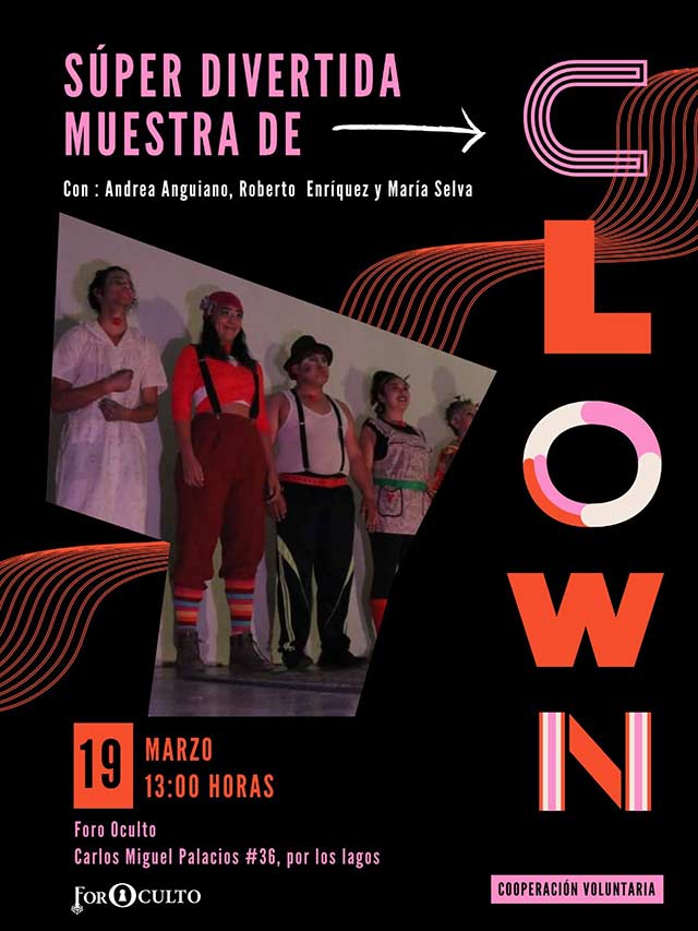Se hace extensiva la invitación a todo el público para que asista a esta Muestra de Clown dominical, que tendrá lugar en el escenario de ForOculto, que se encuentra en la calle Carlos Miguel Palacios 36, por Los Lagos. La cooperación es voluntaria.