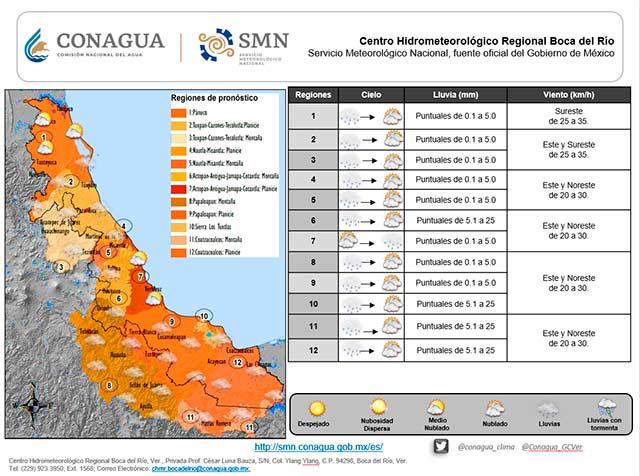 El viento dominará del Sur y Sureste con velocidades que oscilarán entre los 20 a 35 km/h desde el norte de Tamaulipas hasta el norte de Veracruz, mientras que en el resto de esta última entidad será del Este y Noreste de la misma intensidad.