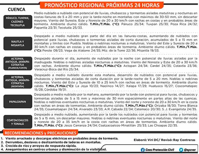 Durante esta jornada persistirá ambiente diurno cálido al medio día y primeras horas de la tarde. La probabilidad de lluvia y tormentas incrementará por la tarde-noche, principalmente en la zona norte y sur del Estado. El viento continuará del Noroeste, Este y Sureste de 20 a 35 km/h en costa.
