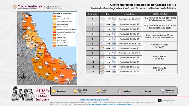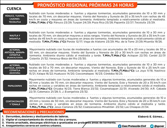 En Veracruz se prevén tormentas puntuales intensas (75 a 150 mm) en el Pánuco, Tuxpan y zonas medias y altas del Jamapa-Cotaxtla y Papaloapan; tormentas puntuales muy fuertes (50 a 75 mm) en el Cazones, Tecolutla, Nautla, Actopan y La Antigua, así como resto del Papaloapan y Jamapa-Cotaxtla, tormentas puntuales fuertes (25 a 50 mm) en el resto de la región.