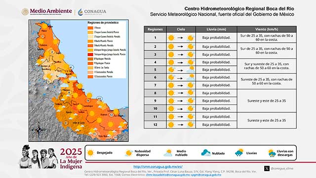 El viento en Tamaulipas dominará del sur de 25 a 35 km/h, con rachas de 50 a 70 km/h en las porciones norte y centro durante la mañana, disminuyendo la intensidad a partir del mediodía. Para la entidad veracruzana será del sur en la porción norte, así como del sureste y este en el centro y sur, en ambos casos de 25 a 35 km/h y rachas de 50 a 60 km/h en costas del norte y centro.