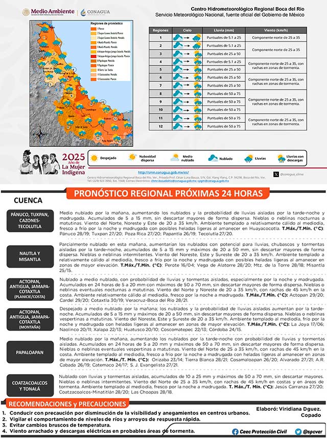 Se prevé la continuidad del temporal lluvioso, los máximos acumulados concentrándose en las cuencas del Papaloapan al Tonalá, disminuyendo mañana. Ambiente fresco a frío por la noche y madrugada. Posibles heladas en partes altas. Viento del Noreste y Norte de 20 a 35 km/h con rachas de 35 a 45 km/h en costas y mayores en áreas de tormenta. Consulte Aviso Especial.