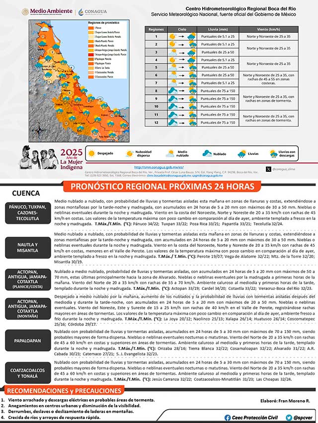 Una vaguada con eje localizado sobre el suroeste del Golfo de México se apoya con la divergencia del viento en altura, por lo cual, se prevé potencial de lluvia y tormentas aisladas, con acumulados de 5 a 20 milímetros de forma general en el estado, con máximos de 50 a 70 milímetros entre las cuencas del Papaloapan al Tonalá y de 30 a 50 milímetros en zonas de llanura y costa del norte, siendo probables mayores de forma dispersa. Viento del Noroeste y norte de 30 a 40 kilómetros por hora con rachas de 50 a 65 kilómetros por hora en la costa central y de 40 a 50 kilómetros por hora en las costas norte y sur. Oleaje de 1.0 a 2.0 metros en las proximidades de la costa.
