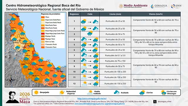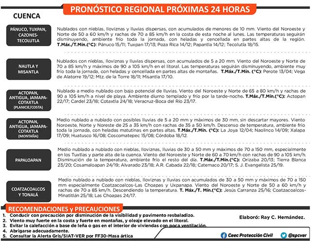 El frente fío número 30 se extiende desde la Florida hasta el centro de Tabasco impulsado por una masa de aire ártico, estimándose que cruce la Península de Yucatán por la tarde. En Veracruz se prevé un día nublado con nieblas, lloviznas, lluvias con tormentas dispersas, en especial en región de montaña, Los Tuxtlas y cuencas del Papaloapan, Coatzacoalcos y Tonalá. El viento del norte se intensifica y alcanzará velocidades máximas de 90 a 105 kilómetros por hora en la costa central y de 70 a 85 kilómetros por hora en la costa norte-sur, 35 a 50 kilómetros por hora en regiones montañosas. La temperatura descenderá marcadamente y el ambiente será frío a fresco. Las condiciones de ambiente húmedo, frío y con viento del norte con rachas muy fuertes estarán presentes hasta mañana martes, disminuyendo gradualmente la intensidad del viento, pero persistiendo las bajas temperaturas.