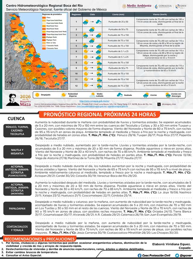 En las próximas 24 horas se prevé un incremento en la probabilidad de lluvias y tormentas aisladas y de intensidad moderada a fuerte a lo largo del estado de Veracruz, siendo probables eventos locales muy fuertes a torrenciales en las cuencas del Nautla-Colipa, Tecolutla y Papaloapan al Tonalá. Vientos del noroeste y norte, con rachas de 95 a 115 kilómetros por hora a nivel de playa, sin descartar la ocurrencia de rachas superiores. Adicionalmente se espera una disminución en las temperaturas y oleaje de 3.0 a 5.0 metros decreciendo durante el martes. Lo anterior, asociado al paso del Frente Frío 41 y su masa de aire ártico que se desplazarán rápidamente sobre la vertiente del Golfo de México.