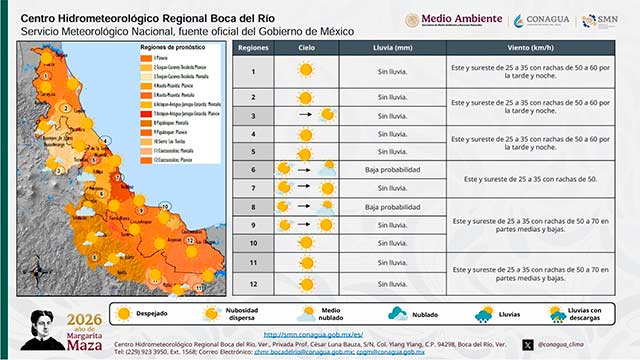 Viernes 1: Despejado a medio nublado. Calima. Probabilidad baja de lluvia y tormentas; sin embargo, no se descartan eventos dispersos en la región montañosa central en los límites con el estado de Puebla. Ambiente muy caluroso al mediodía y primeras horas de la tarde. Viento del este, sureste y suroeste de 25 a 35 kilómetros por hora con rachas máximas de 50 a 70 kilómetros por hora en la región de Los Tuxtlas y entre Jesús Carranza-Acayucan y de 35 a 50 kilómetros por hora en la costa norte y regiones de Orizaba y valle de Perote. Oleaje de 1.0 a 2.0 metros cerca de la costa.
