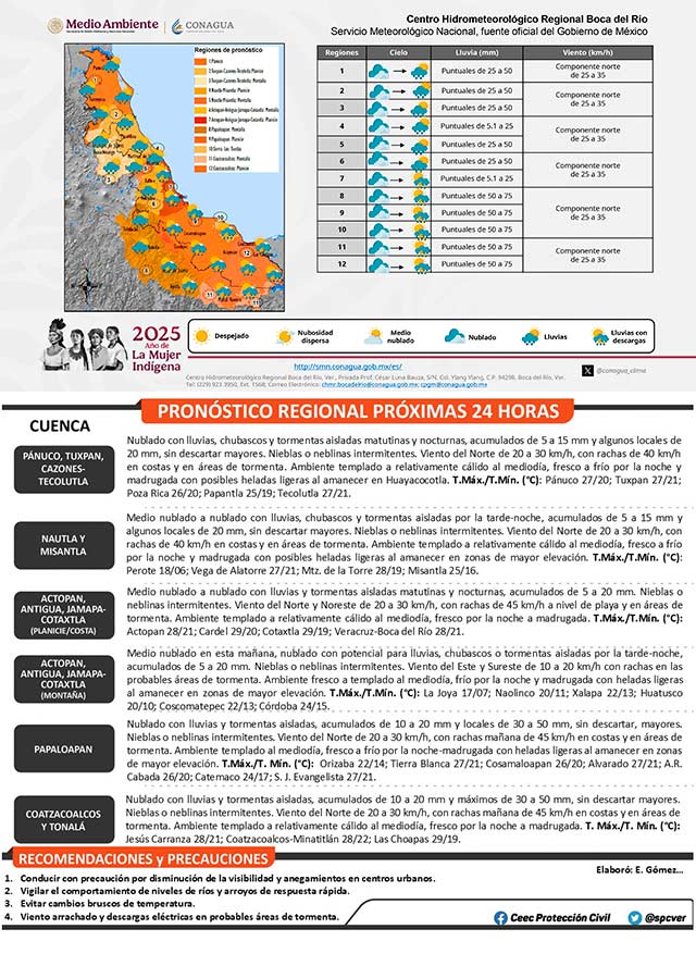 Jueves 25: Probabilidad de lluvias y tormentas aisladas de 5 a 20 milímetros en promedio en el estado con máximos de 30 a 50 milímetros en la cuenca del río Blanco, llanuras y costas del centro y entre las cuencas del Papaloapan al Tonalá, siendo probables mayores a estos rangos de forma dispersa. Viento del norte, noreste, este y sureste de 20 a 35 kilómetros por hora con rachas de 45 kilómetros por hora en la costa centro y sur, y mayores en áreas de tormentas. Ambiente templado a relativamente caluroso. Oleaje de 0.5 a 1.0 metros en las proximidades de la costa.