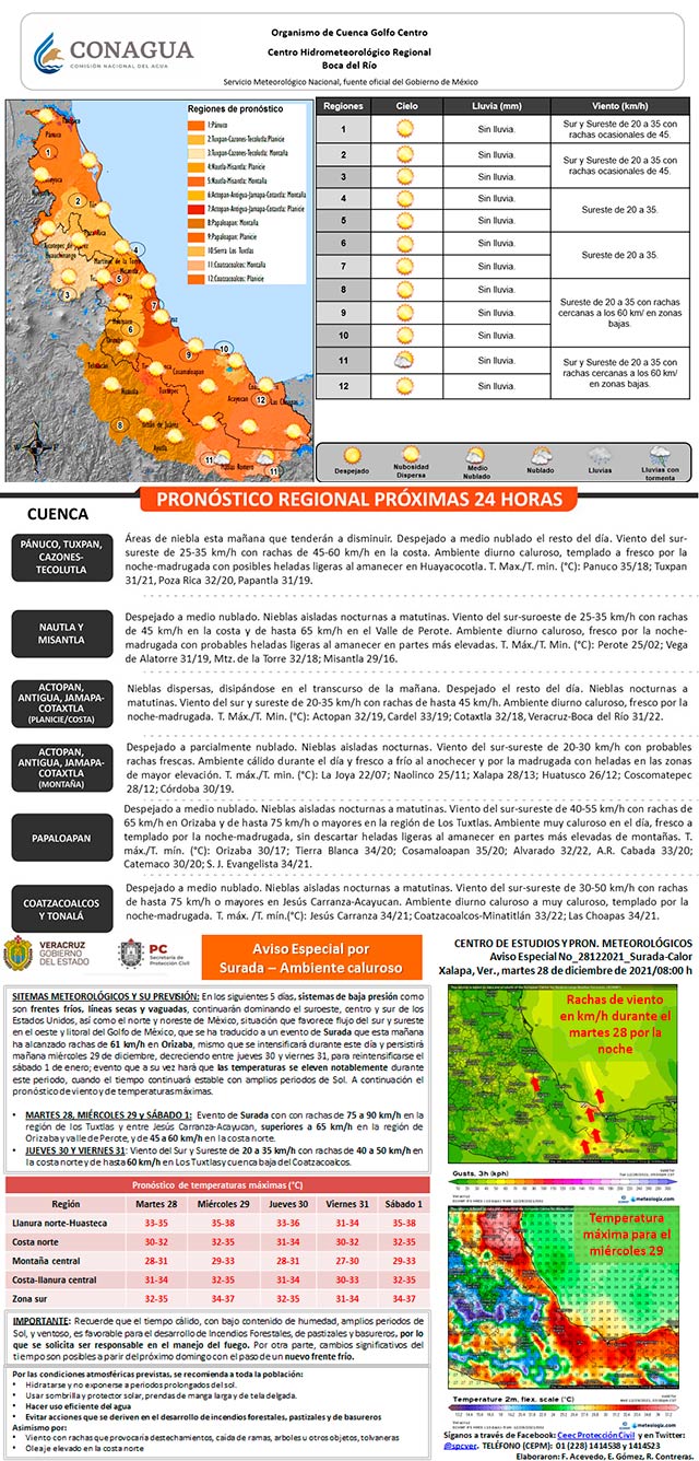 Durante este día se prevé un evento de surada que podría alcanzar rachas frescas a fuertes en varios puntos de la entidad veracruzana, lo cual apoyaría un ambiente caluroso y seco, siendo de riesgo para el desarrollo de incendios forestales, pastizales y/o basureros. Tales condiciones se extenderían al miércoles. Consulte el Aviso Especial.