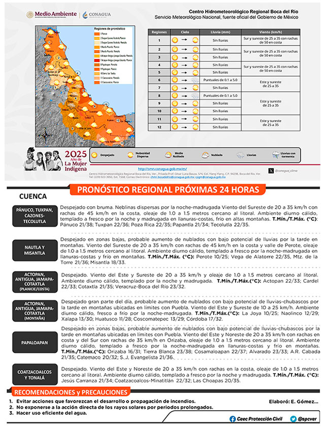Hoy se espera ambiente diurno cálido y bajo potencial de lluvias en el estado de Veracruz, excepto en montañas ubicadas en límites con Puebla, donde se pueden presentar chubascos de corta duración. Tome precauciones.