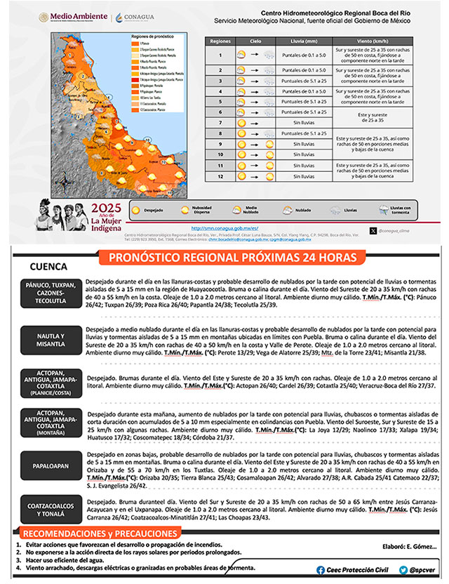 Por su parte, el potencial de lluvias continuará limitado principalmente en las llanuras-costas, sin embargo, derivado del fuerte calentamiento diurno, los efectos de la orografía y pulsos de aire húmedo en niveles bajos podrían apoyar el desarrollo de nublados con potencial para lluvias, chubascos y tormentas aisladas de corta duración especialmente montañas de Veracruz colindantes con Hidalgo y Puebla.