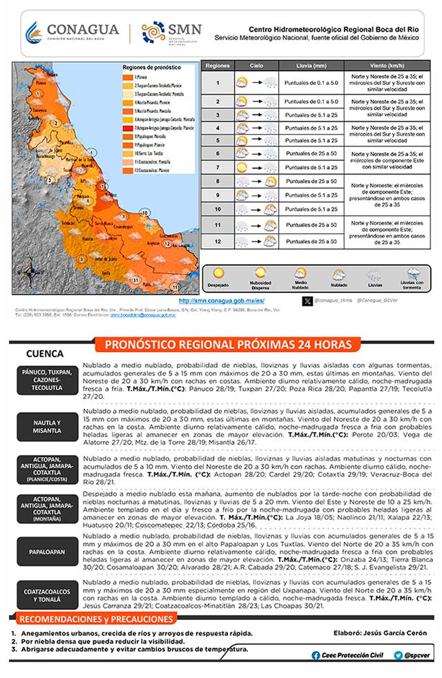Finalmente se prevé que a partir de mañana miércoles disminuyan los nublados y el potencial de lluvias, el viento del sureste, este y noreste moderado en costas y ambiente diurno cálido, pero noches-madrugadas frescas a frías con probables heladas ligeras al amanecer en las zonas de mayor elevación. Pendientes de siguientes informes meteorológicos y tomar sus precauciones.