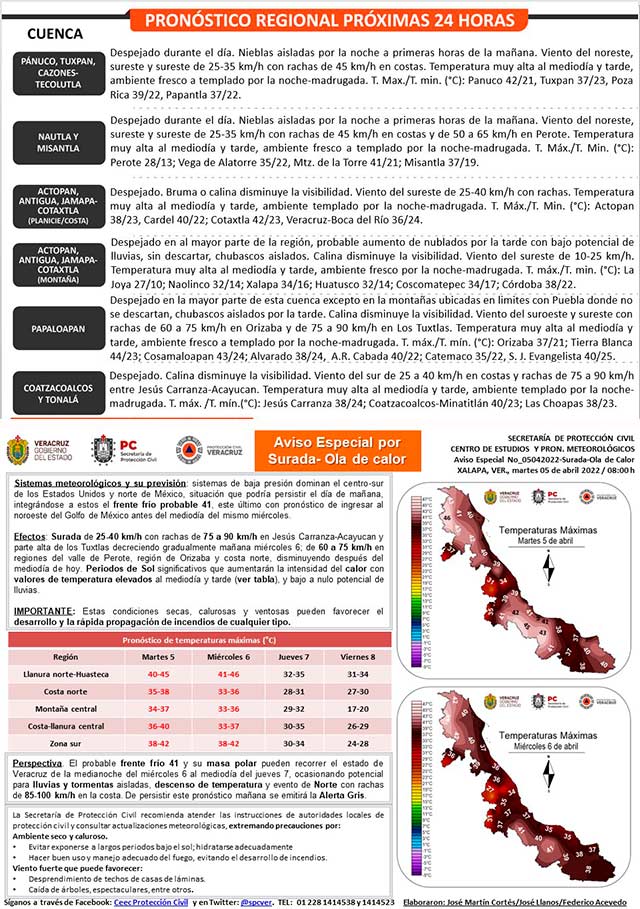 Siguientes 24 a 48 horas continuará dominando una ola de calor en territorio veracruzano. Surada fuerte en Perote-Orizaba, cuenca baja del Coatzacoalcos y bajo potencial de lluvias en montañas, donde no se descartan chubascos. Extreme precauciones.