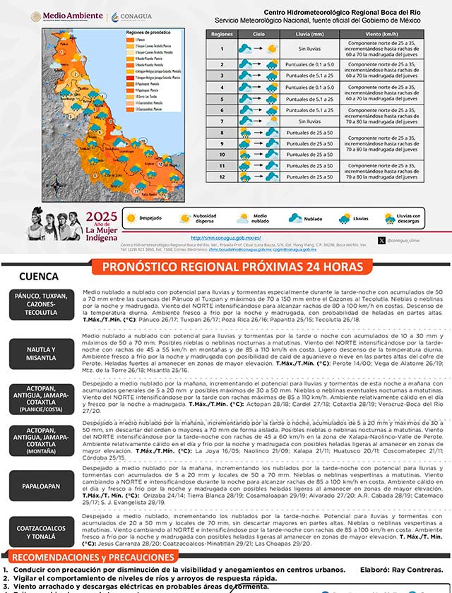 Previendo que en Veracruz se presenten tormentas puntuales fuertes (25 a 50 mm) en las cuencas del Papaloapan, Coatzacoalcos y Tonalá, especialmente en partes bajas, así como la región de Los Tuxtla; lluvias con intervalos de chubascos (5.1 a 25 mm) en el resto de las zonas montañosas; lluvias escasas o lloviznas (0.1 a 5.0 mm) aisladas en el resto del Tecolutla y Nautla. Mientras que en Tamaulipas se mantendrá baja la probabilidad de lluvias durante este periodo de pronóstico.