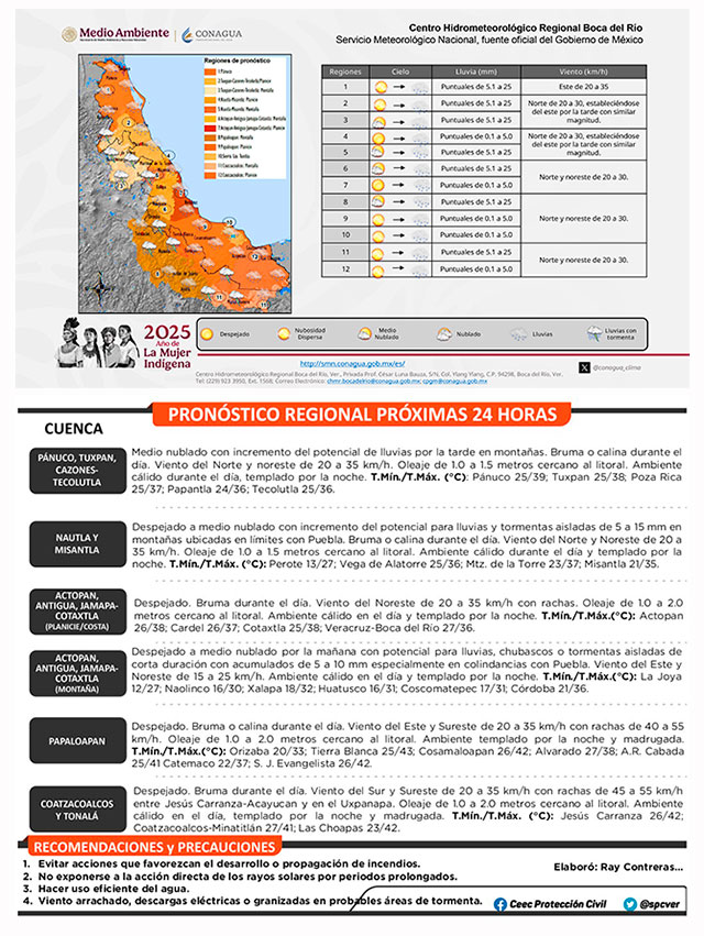 El pronóstico continúa indicando que la ola de calor podría comenzar a atenuarse a partir de hoy y terminar mañana. No obstante, las temperaturas diurnas seguirán con valores elevados, pero disminuyendo gradualmente la intensidad del mismo en el norte y centro. El pronóstico indica que durante este día el viento continuará con rachas fuertes del sur en Los Tuxtlas, Jesús Carranza-Acayucan con ambiente diurno muy cálido y bochornoso. Por su parte, el potencial de lluvias comenzará a incrementar con chubascos y tormentas aisladas de corta duración especialmente montañas de Veracruz colindantes con Hidalgo y Puebla durante esta tarde y especialmente el fin de semana. Consulte el Aviso Especial.