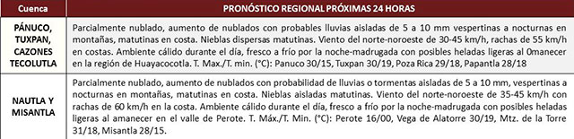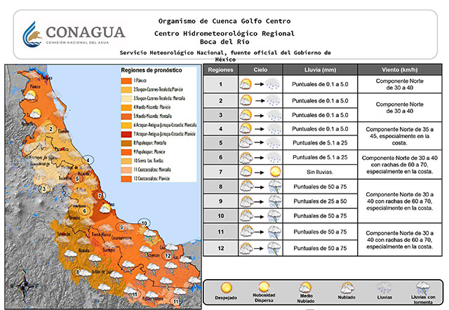 Mientras tanto, el frente estacionario número 5 se localiza en el Este-Sureste del Golfo de México, donde interactúa con la circulación de Gamma, en tanto que en el suroeste del mismo Golfo una vaguada domina la región. Tal situación favorece un día parcialmente nublado en Veracruz, con probabilidad de lluvias o tormentas aisladas en el sur del Estado, siendo probables acumulados de lluvia de 5 a 10 milímetros y puntuales de 30 a 50 milímetros en la zona de Los Tuxtlas, Las Choapas y Uxpanapa. En la costa el viento del noroeste-norte desarrollaría rachas fuertes de 50 a 70 kilómetros por horas con oleaje elevado.