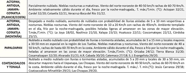 Sábado con cielo despejado a medio nublado en Veracruz con probabilidad de lluvias en áreas de montaña y en el sur de la entidad. En la costa, el viento del norte-noroeste desarrollaría rachas frescas a fuertes, generando oleaje. Las temperaturas diurnas serán elevadas pero el ambiente fresco a frío por las noches y madrugadas. Se recomienda extremar las precauciones pertinentes y consultar la Alerta Gris.