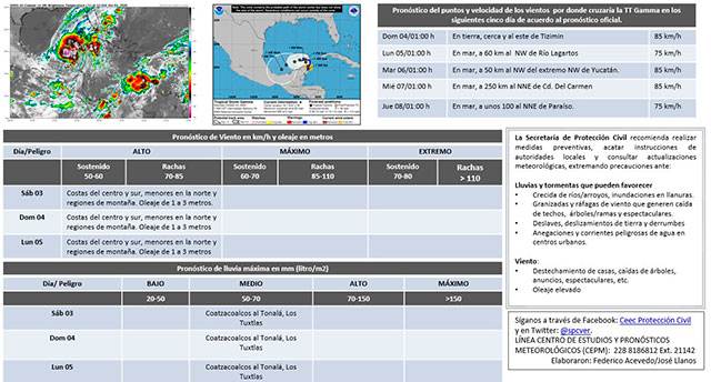 A las 7:00 horas, el centro de la tormenta tropical Gamma se localiza a 65 kilómetros al sur-sureste de Tulum. Vientos máximos sostenidos de 100 kilómetros por hora con rachas mayores. Movimiento al noroeste a 15 kilómetros por hora. Presión mínima central de 987 mb. Se prevé que Gamma ingrese al Este de la península de Yucatán en el transcurso de este día y estaría cerca de la costa norte de la Península el domingo.