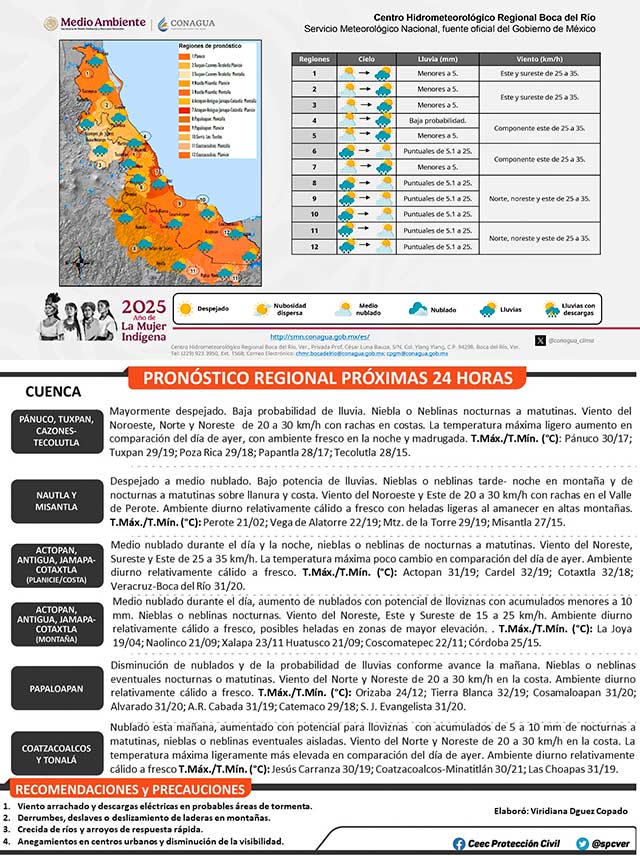 Durante esta jornada persistirán condiciones limitadas para lluvias a lo largo del territorio veracruzano; sin embargo, no se descartan algunos eventos ligeros de carácter aislados. Nieblas y neblinas eventuales. Ambiente relativamente cálido a cálido al mediodía, mientras que templado a frío por las noches y madrugada. Viento del noreste, este y sureste 20 a 35 kilómetros por hora en costa.