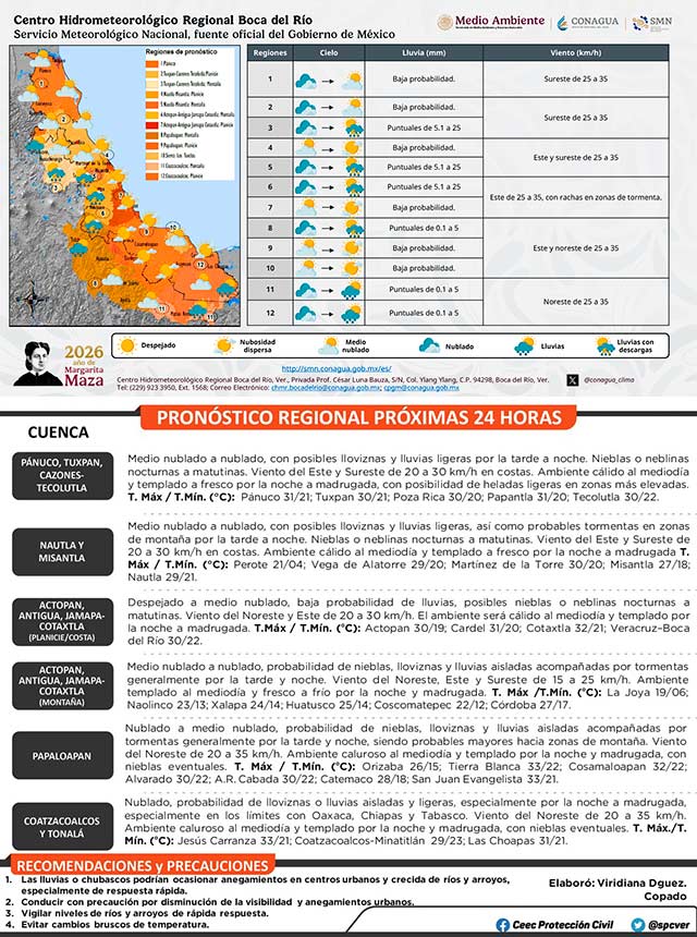 Se localiza una vaguada al suroeste del Golfo de México. En Veracruz se espera cielo medio nublado. Si bien el potencial para lluvias disminuye respecto a días pasados, se pueden presentar algunos eventos ligeros a moderados, acompañados de tormentas en regiones de montaña y cuencas del norte. Viento dominante del noreste, este y sureste de 20 a 35 kilómetros por hora con algunas rachas en la costa. Oleaje de 1.0 a 1.5 metros. La temperatura máxima aumenta gradualmente mientras que el ambiente se mantendría de fresco a frío por las noches-madrugadas. Probabilidad de heladas ligeras en partes altas.