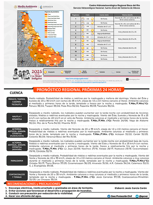 El viento prevalecerá del sureste, este y noreste de 25 a 35 kilómetros por hora con rachas de 40 kilómetros por hora en el Valle de Perote y de 45 kilómetros por hora en la costa norte, oleaje de 1.0 a 2.0 metros cercano al litoral.