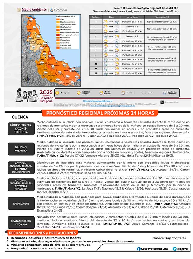Esta mañana amanece con cielo parcialmente nublado y potencial para lluvias, chubascos y tormentas a lo largo de la entidad, especialmente por la tarde-noche a madrugada en regiones de montaña, y por la madrugada a primeras horas de la mañana en llanuras y costas.