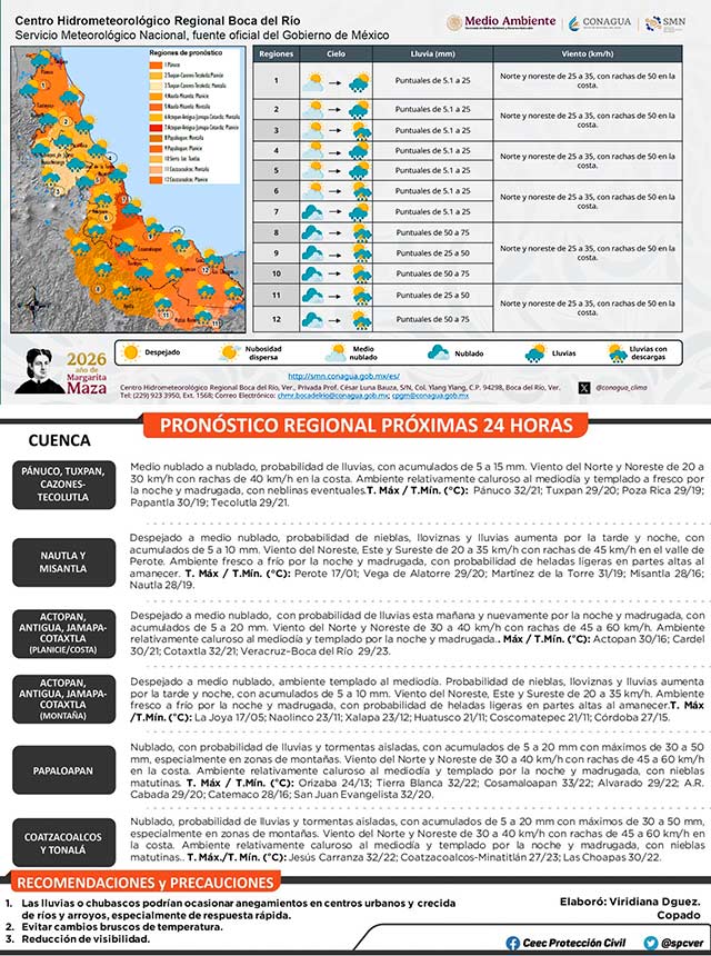 Durante esta jornada se prevé probabilidad de lluvias y tormentas aisladas a lo largo del estado, principalmente en cuencas del Papaloapan al Coatzacoalcos. Viento del noroeste y norte de 30 a 40 kilómetros por hora con rachas de 45 a 60 kilómetros por hora en las costas centro y sur, y menores en la norte, oleaje de 1.0 a 2.0 metros. Consulte Aviso Especial.