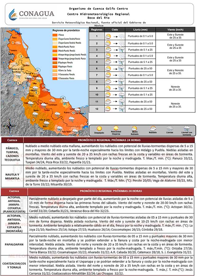 Sobre el Golfo de México dominará un sistema de alta presión que apoyará tiempo caluroso con sensación de bochorno en regiones de llanura y costa, así como mayores periodos de sol. Por su parte, la vaguada en el suroeste del Golfo de México y otra más del norte al sur del país generarían condiciones para lluvias de forma aislada y dispersa en montañas y porción sur con acumulados de 5 a 15 milímetros y puntuales mayores de 30 milímetros, sin descartar actividad eléctrica.