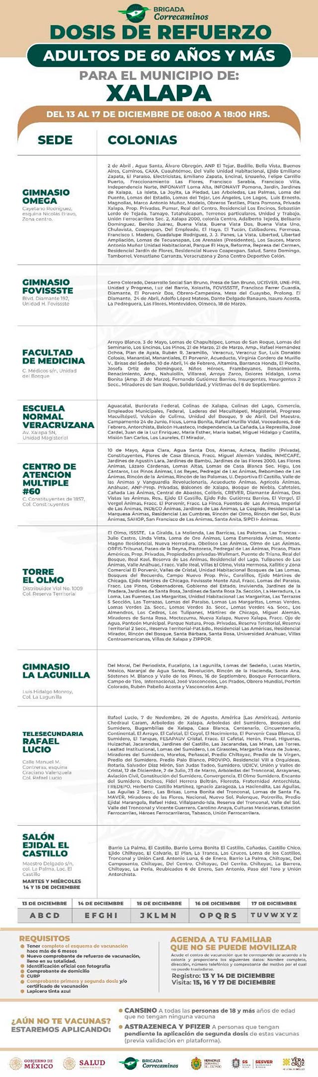 Como requisitos se debe contar con una identificación oficial, tener más de 60 años, haber recibido las dos dosis previas y ser del municipio de Xalapa, de lo contrario no podrán ser inoculados.
