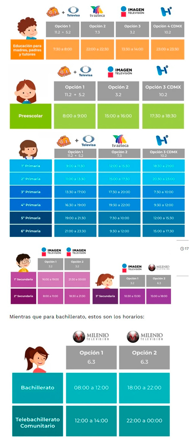 Para educación básica que comprende preescolar, primaria, secundaria se transmitirán por los siguientes canales 11.2, 5.2, 7.3 y 3.2 a través de Canal Once, Televisa, Tv Azteca, Ingenio Tv e Imagen Televisión.