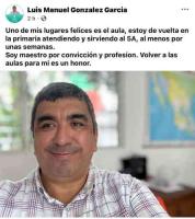 El profesor Luis Manuel González García, exdirector del Colegio Preparatorio de Xalapa, confirmó en redes sociales su regreso a clases frente a grupo en una escuela primaria. “Uno de mis lugares felices es el aula. Estoy de vuelta en la primaria atendiendo y sirviendo al 5A, al menos por unas semanas”, publicó el docente en su cuenta personal. “Soy maestro por convicción y profesión. Volver a las aulas para mí es un honor”.