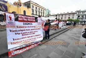 Docentes del Movimiento Democrático Magisterial Veracruzano (MDMV) se manifestaron en Plaza Lerdo para exigir la intervención del Gobierno del Estado ante la serie de irregularidades y omisiones por parte de la Secretaría de Educación de Veracruz (SEV) y del Instituto de Pensiones del Estado (IPE).