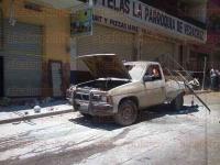 Los hechos se suscitaron la tarde de este miércoles, cuando la camioneta, que trasladaba un tanque con una fuga, al pasar por el mercado "Benito Juárez" explotó al rosar con una lámina, provocando pavor entre la gente.