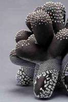 “Ambos proyectos son resultado del ejercicio virtuoso en el torno. Por su parte, Vara trabaja en dos series. La primera utiliza jarrones como soporte para experimentar casi pictóricamente con los esmaltes, recordando el valor plástico de la escultura. Cual lienzo, los recipientes se despliegan en un espacio de color y texturas. La segunda serie mantiene su búsqueda desde las formas geométricas que devienen en cuerpos autónomos con la presteza técnica que le ha enseñado el modelado”.