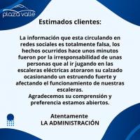 Después de 30 minutos personal de la plaza comercial permitió que la gente volviera a ingresar a las instalaciones de ésta, mientras la gerencia de Plaza Valle informó, que la movilización fue resultado de la irresponsabilidad de un grupo de personas que jugando atoraron sus agujetas en las escaleras eléctricas.