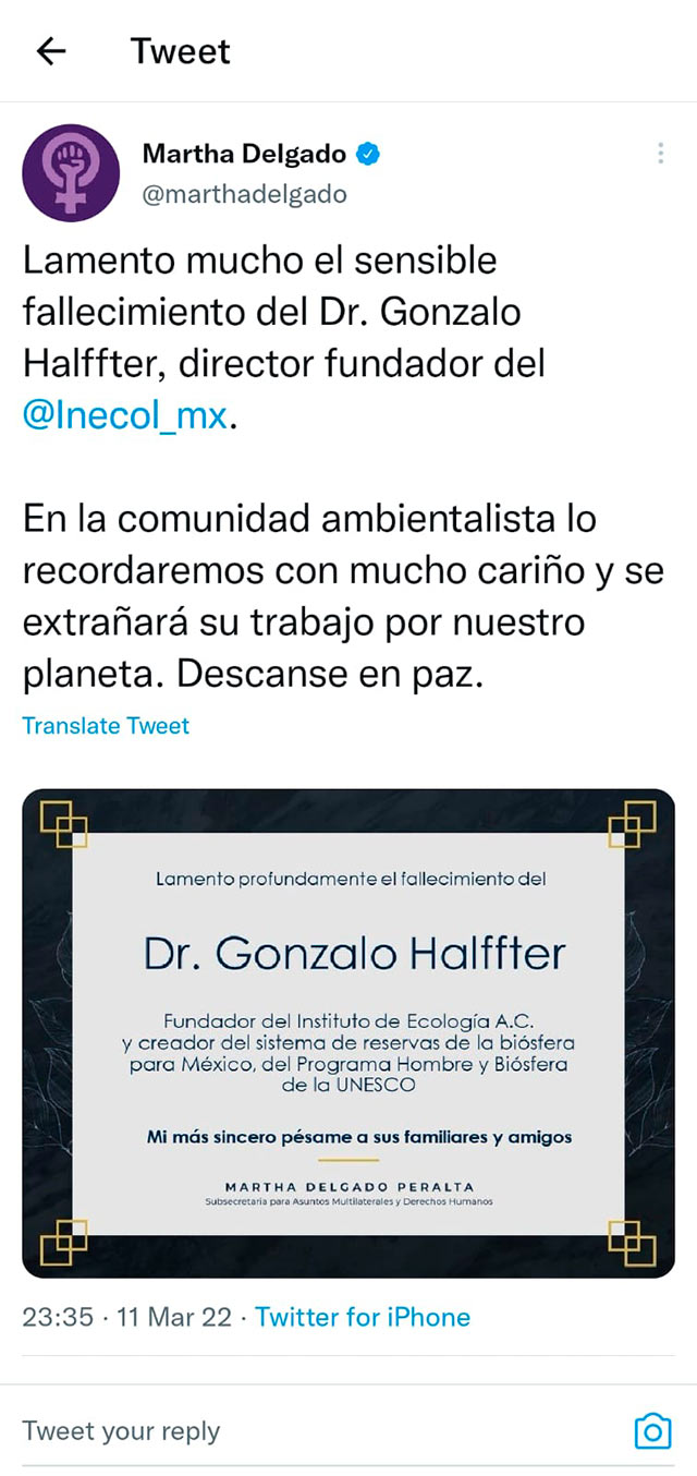 "Con profunda pena, les comunicamos que esta tarde falleció nuestro Director Fundador, el doctor Gonzalo Halffter Salas", refirió el instituto.