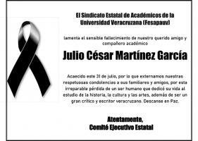 El Sindicato Estatal de Académicos de la Universidad Veracruzana (FESAPAUV) informó del fallecimiento del académico Julio César Martínez García, este 31 de julio.